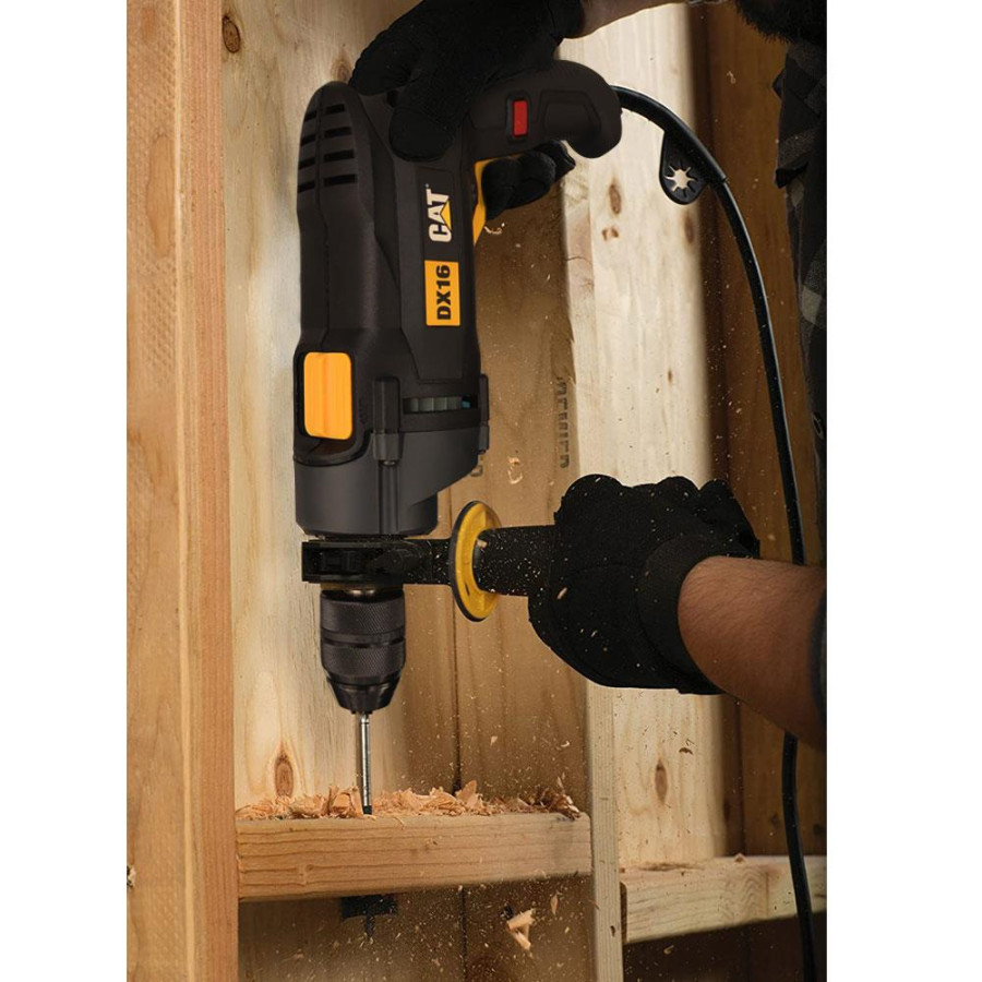 Двигатель мощностью 850 Вт с регулировкой скорости оборотов, помогает выполнять самые тяжелые задачи и обрабатывать различные материалы: дерево, металл, бетон, кирпич. Быстрозажимной патрон обеспечивает удобную замену сверл диаметром до 13 мм. А благодаря прорезиненной дополнительной и основной ручке и ограничителю глубины сверления, работать с CAT DX16 очень удобно и безопасно.