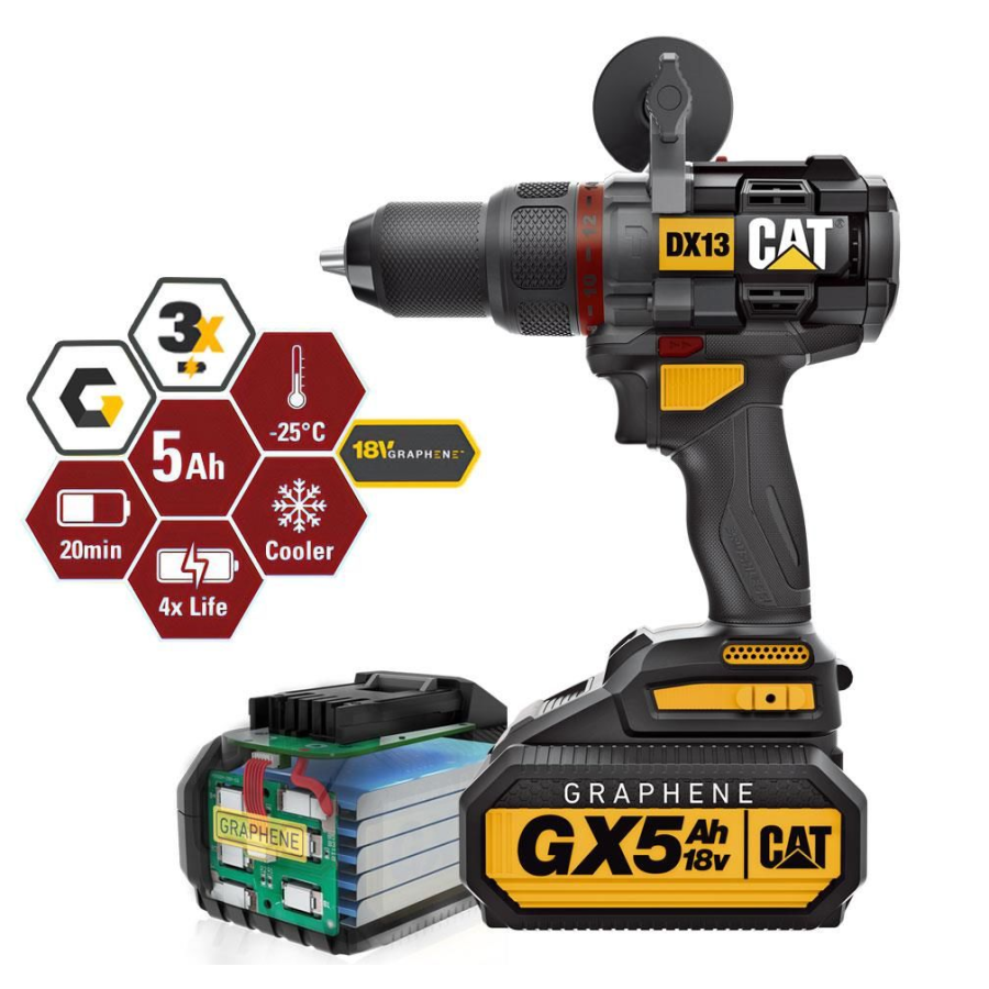Дрель-шуруповерт CAT DX13 использует инновационную технологию с графеновым аккумулятором. Они быстрее заряжаются и имеют более долгий срок службы. Графеновый полимер интегрирован в катод аккумуляторных элементов для повышения производительности батареи. Благодаря этому, графеновые батареи имеют существенные преимущества перед литий-ионными, а именно: полная зарядка за 20 мин, может работать при температуре до -25˚C, в 4 раза дольше срок службы, чем у литий-ионного аккумулятора.